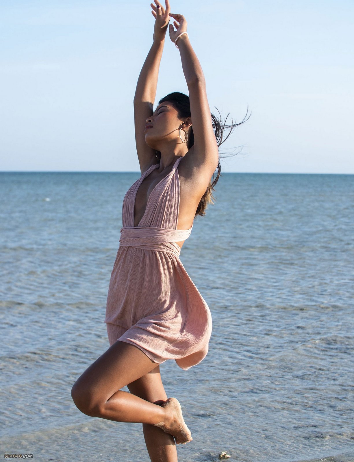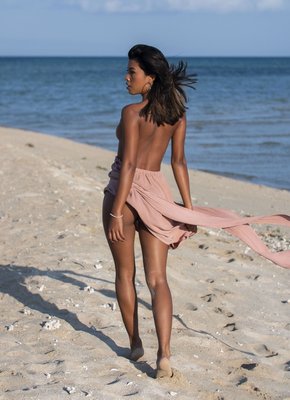 Описание: Чувственно извиваясь всем телом на горячем песке и постепенно снимая перед камерой короткое платье, эротическая темнокожая модель с миниатюрными титечками развратно позирует обнаженной на пляже и, совершенно ничего не скрывая от нас, бесстыже раскрывает свою бритую темную пизду.