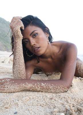 Темнокожая модель позирует обнаженной на пляже