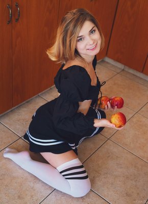 Описание: Только что вернувшись из магазина и с удовольствием сняв с себя всю одежду, молодая голая любовница вовсю развлекается на кухне и горячо изгибается перед камерой в разных откровенных позах, высоко задирая стройные ноги и выставляя на показ бритую маленькую пиздёнку.