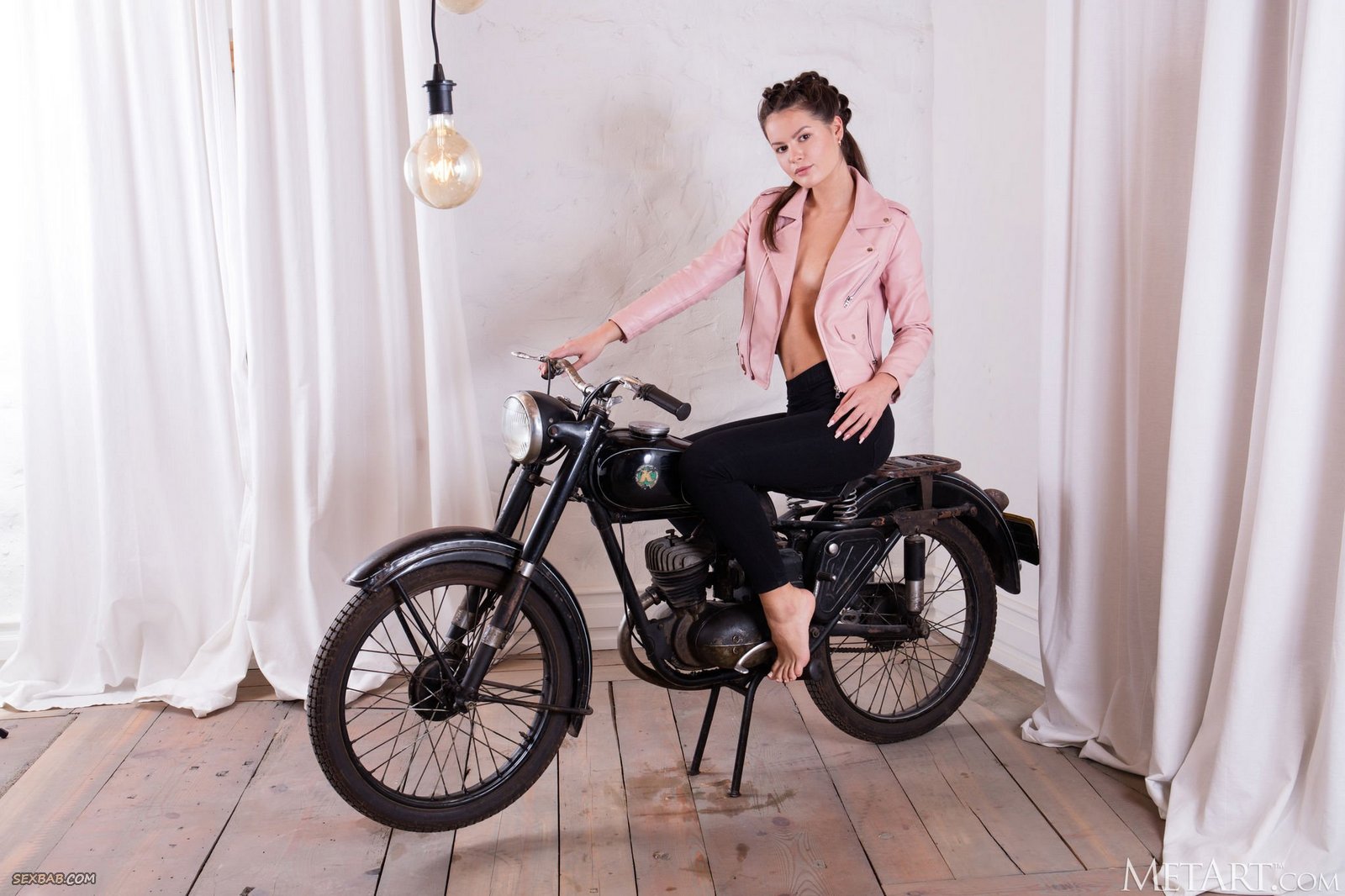Описание: Медленно сняв с себя обтягивающие штаны, молодая байкерша полностью разделась перед камерой и с удовольствием показала свою красивую упругую попу. Затем, страстно оседлав мотоцикл, стройная девушка развратно раскрыла перед нами голую гладкую промежность и крупным планом выпятила нежную розовую киску.