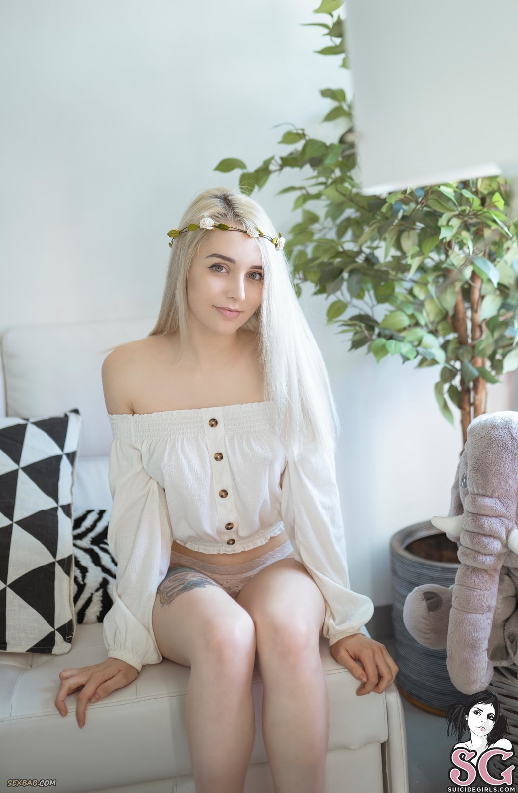 Описание: Скромная молодая нимфа в легкой белой одежде немного стеснительно сняла перед камерой свою кофточку с трусами и полностью оголила красивые упругие титечки. Удобно устроившись на диване, обнаженная милашка в позе раком игриво флиртует с фотографом, скрывая от него свою бритую писечку.