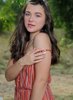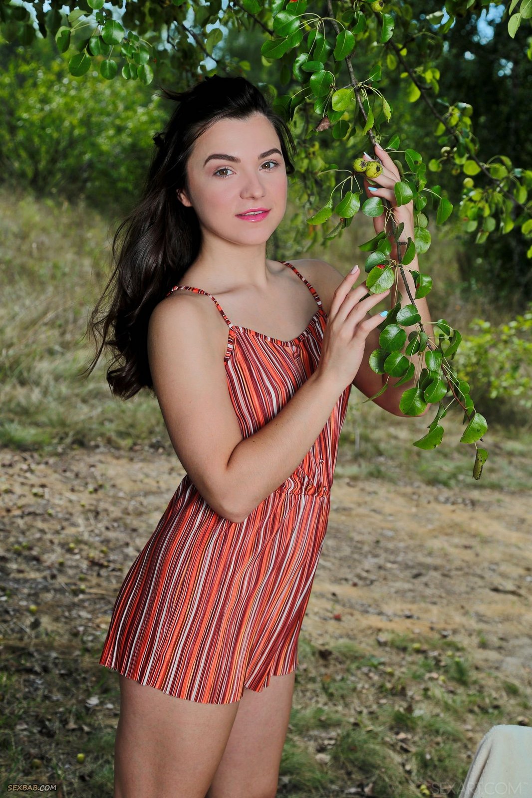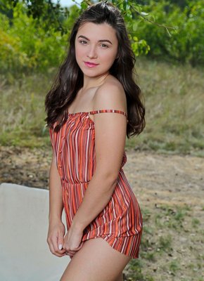 Описание: Сексуальная развратная брюнетка в летнем комбинезоне соблазнительно медленно сняла с себя всю одежду и показала свои голые прелести на камеру. Чувственно позируя на фоне природы, молодая детка с миниатюрными сиськами усаживается на заранее принесенный стул и широко раздвигает ноги с голой бритой промежностью.