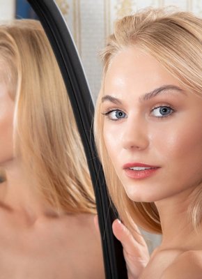 Блондинка мастурбирует перед зеркалом