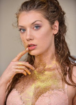 Описание: Обаятельная эротическая модель и порно актриса Елена Кошка позирует перед камерой измазав руки золотыми блёстками, а вскоре скидывает с себя халатик и трусики с лифчиком, после чего устроившись в кресле широко раздвигает ноги. Продолжая соблазнять нас откровенными кадрами, сексуальная девушка с маленькой грудью моментально принимается нежно ласкать бритую письку пальцами, при этом демонстрируя анальную пробку в тугой попке.