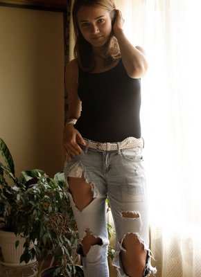 Описание: Привлекательная молодая девка с худенькой фигурой, нарядившись в рваные джинсы и майку принимается эротично позировать дома. Располагаясь на кровати, сексуальная стройняшка немного засвечивала трусики через дырки, ощущая от происходящего возбуждение и удовольствие.