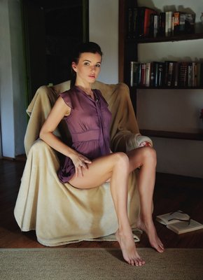 Описание: Строя глазки привлекательному фотографу, сексапильная худышка с маленькими сиськами медленно скидывает полупрозрачное платье и голая позирует в кресле, стараясь чередовать самые возбуждающие позы, в том числе вставая раком. А нежно трогая себя руками, молодая стройняшка раздвигает худые ножки и демонстрирует бритую письку с гладким лобком.