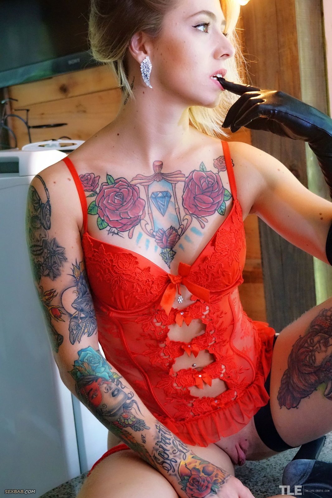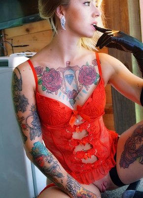 Описание: Надев красный корсет, красивая девушка с татуировками на голом теле и повязкой на глазах, но без трусиков, стоя на кухне, начинает страстно и максимально возбуждающе позировать. Показывая сексуальное тело и нежно трогая себя руками, очаровательная крошка забирается на стол, где раздвигая промежность выставляет на показ розовую бритую письку.