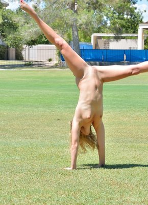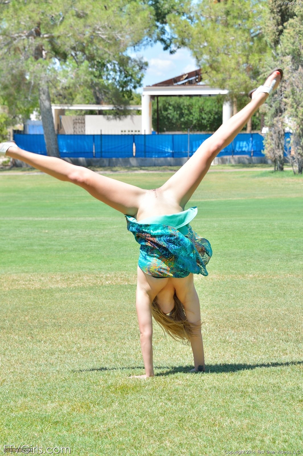 Описание: Гуляя в парке, весьма симпатичная светловолосая девушка в коротком платье без трусов, улыбаясь на камеру, в будущем медленно раздевается до гола. Возбудившись, сексуальная милашка подробно демонстрирует маленькие сиськи и бритую письку, порой вставая на руки и раздвигая длинные ноги.