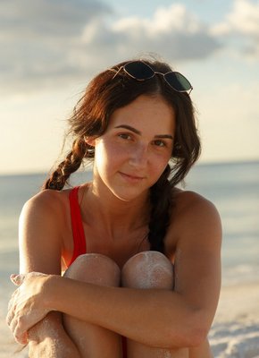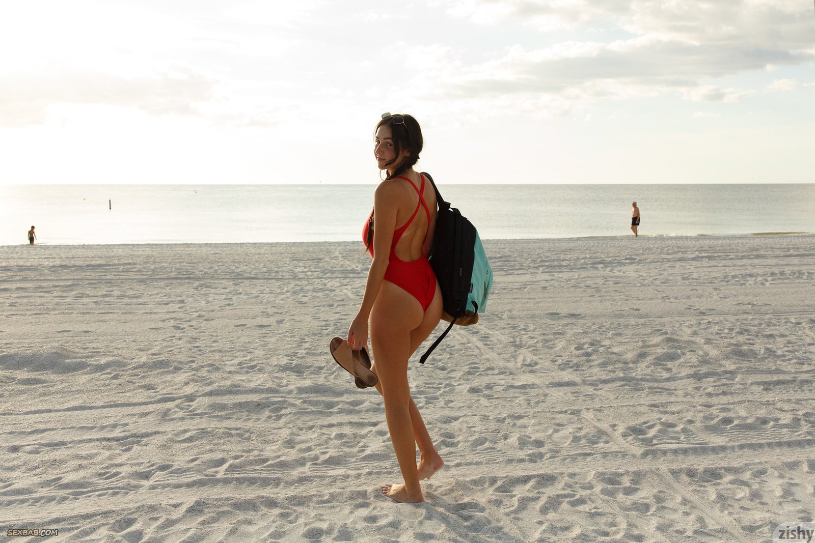 Описание: Нарядившись в цельный красный купальник, девица с шикарной попой начинает эротично гулять и позировать на пляже, в процессе валяясь на песке. Наслаждаясь летним днем, сексуальная красотка чаще всего прогибалась раком и ложилась на животик, оттопыривая измазанные ягодицы.