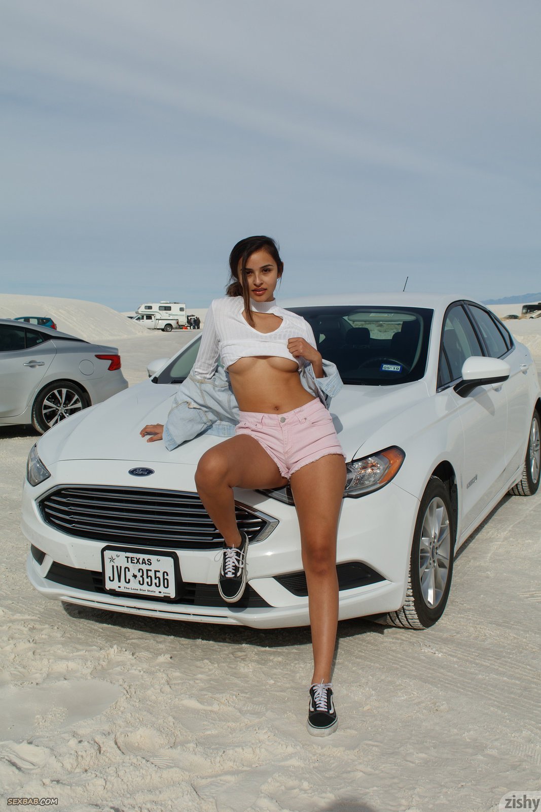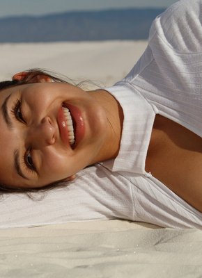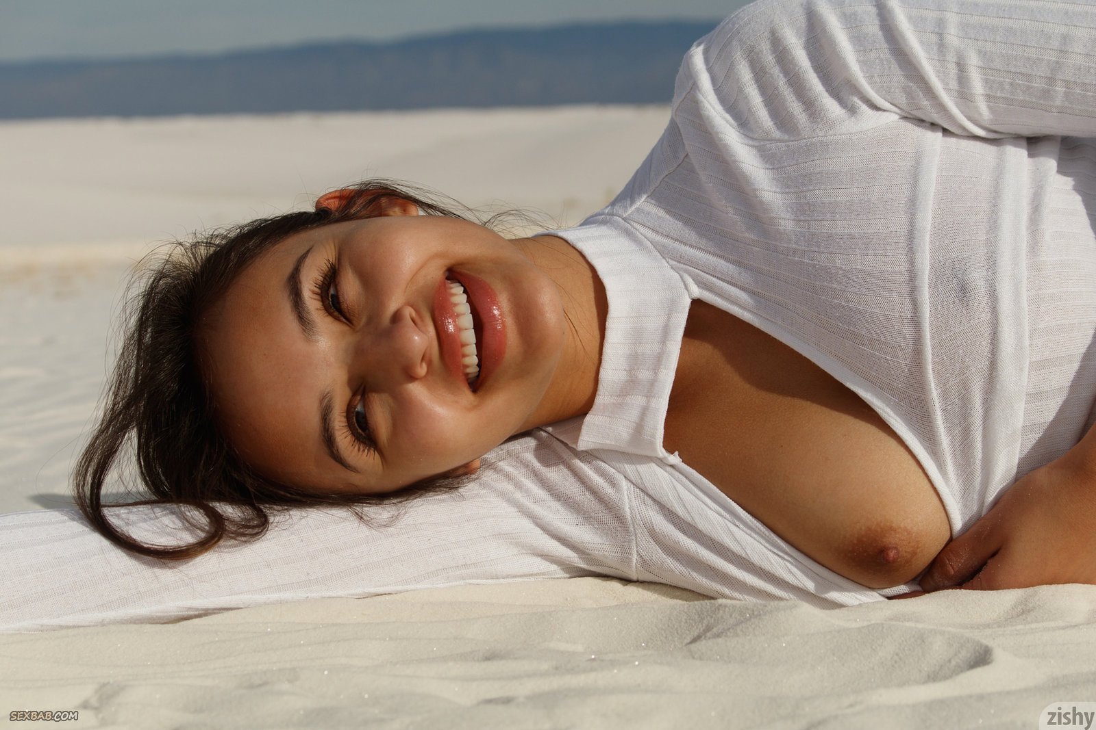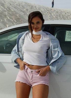 Описание: Улыбаясь и строя глазки на камеру, красивая модель в коротких шортах и кофточке без лифчика начинает эротично позировать и менять самые возбуждающие ракурсы вставая раком на песке. Кокетливо кривляясь, сексуальная девушка немного засвечивала ягодицы, а так же показывала натуральные сиськи.