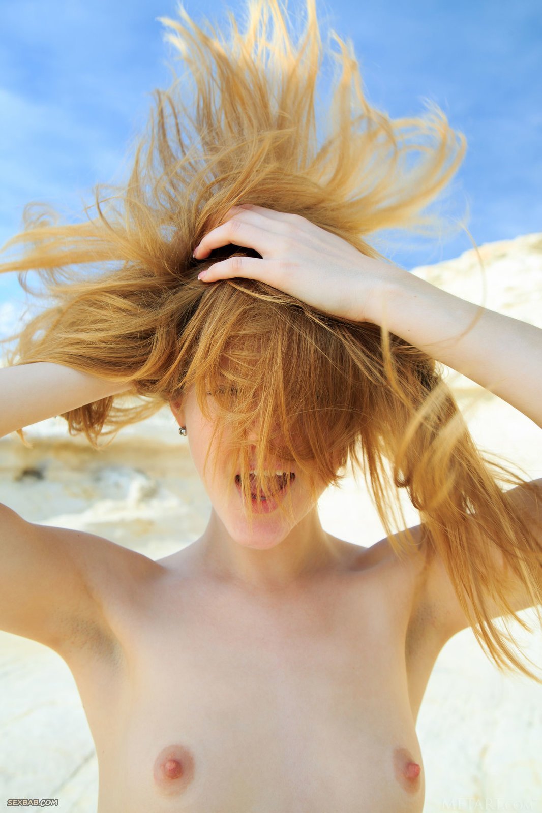 Описание: Полностью голенькая рыженькая девушка с сексуальным телом и маленькими сиськами с набухшими от возбуждения сосочками начинает эротично позировать у моря. В процессе обворожительная крошка старалась ложиться на бок, выставляя на показ попку, а так же немного раздвигать ножки, что позволяло засвечивать бритый лобок и гладенькую письку.