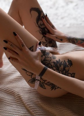 Описание: Скинув кофту, очаровательная девка с татуировками и пирсингом в носу, забравшись на кровать, показывает себя перед фотокамерой в нижнем белье белого цвета. Наслаждаясь съёмкой, сексуальная стройняшка нежно поглаживает себя руками и в будущем все же оголяется, немного делая акцент на маленьких возбужденных сиськах и попке.