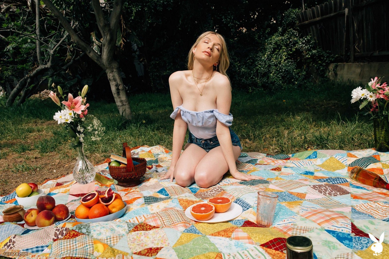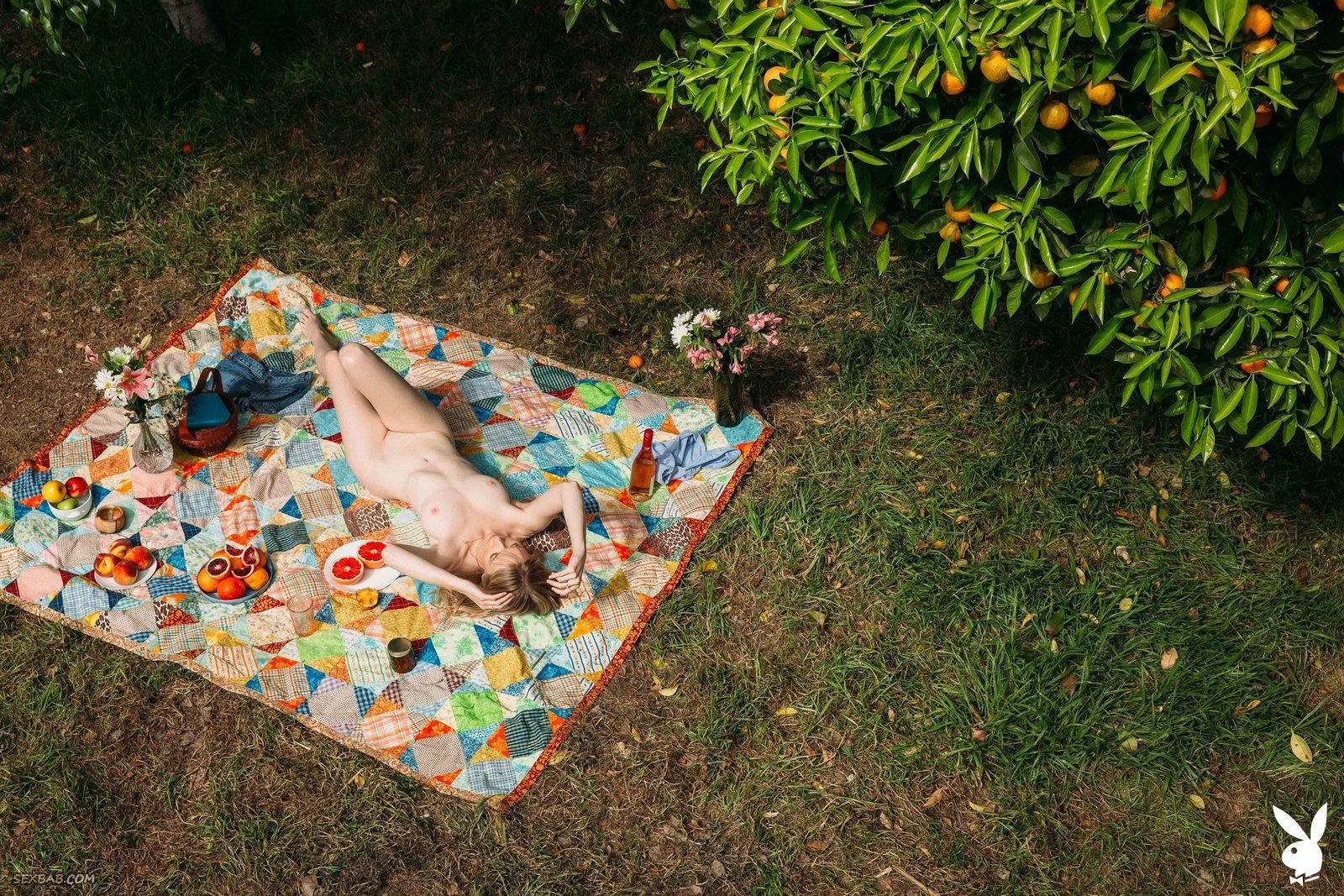 Описание: Прогуливаясь в саду, красивая светловолосая модель высокого роста в будущем располагается на подстилке и медленно снимает с себя короткие джинсовые шорты и майку. В обнаженном виде сексуальная девушка продемонстрировала подтянутые натуральные сиськи и гладенькую письку с лобком.