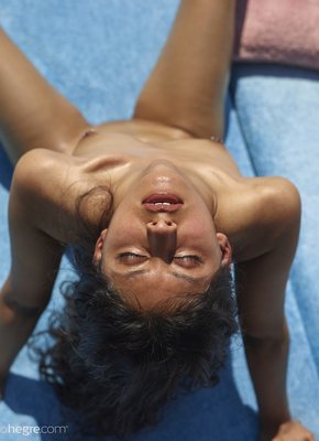 Описание: Экзотической внешности тощая брюнетка голой загарает на заднем дворе своего дома. Девушка намазалась каким-то маслом, от чего её худенькое тело буквально светится в лучах солнца. А принимая откровенные позы она позволяет нам насладиться всеми её прелестями, включая маленькие сиськи и бритую письку.