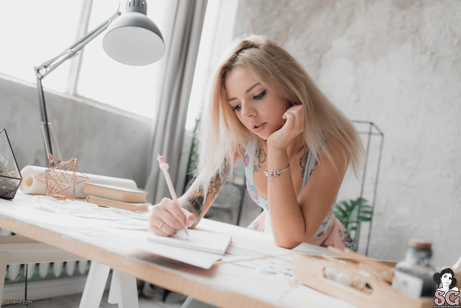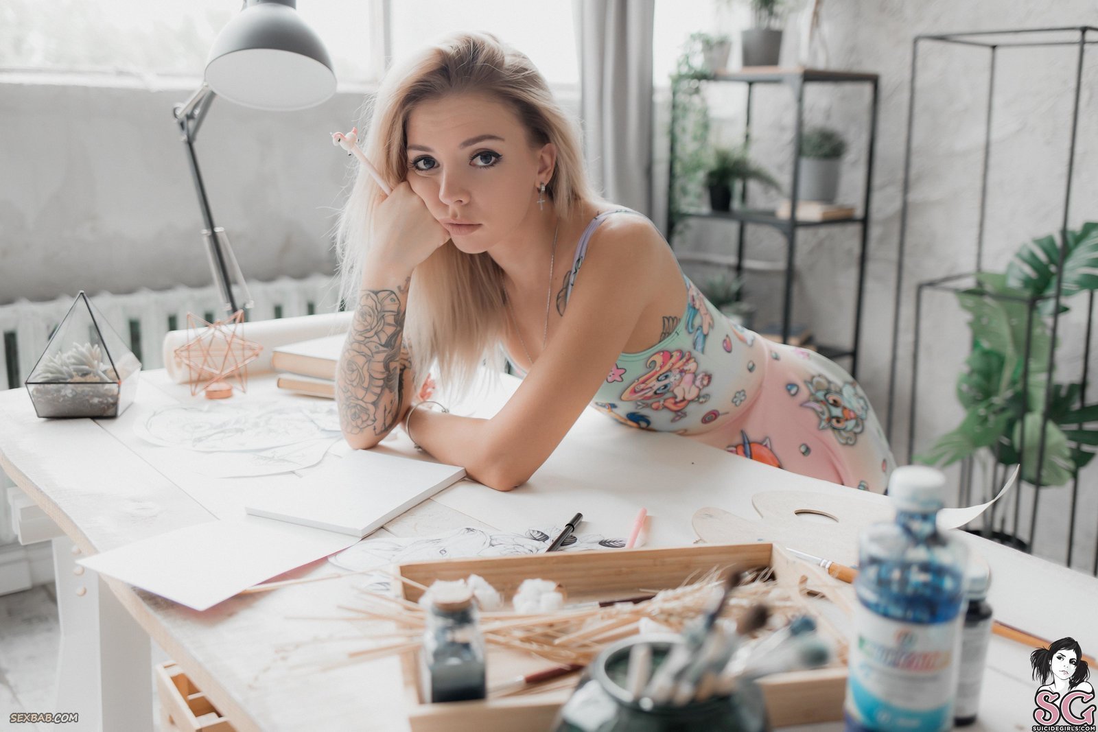 Описание: Молодая милая девка в татуировках по всему телу позирует перед камерой и эротично задирает юбку, после чего акцентирует наше внимание на её белых трусиках. Получая от фотографа ценные указания, сексуальная блондинка порой показывала маленькие сиськи и возбуждающую письку с упругими ягодицами, делая это очень соблазнительно и страстно.