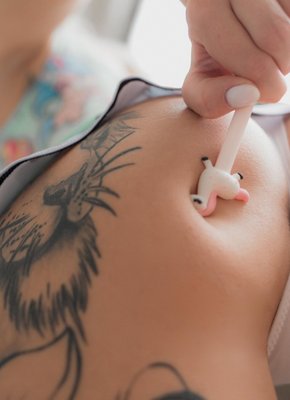 Милая девка в татуировках эротично задирает юбку