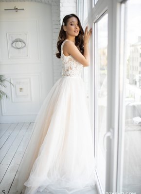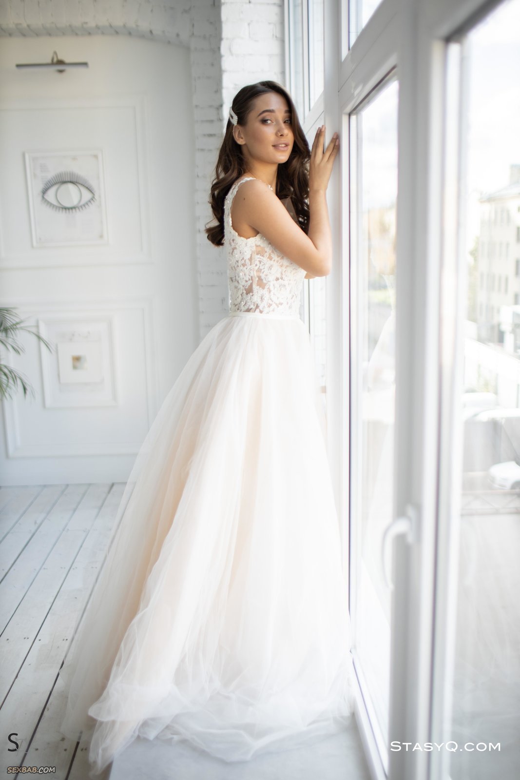 Сексуальная невеста в чулках позирует в платье и без