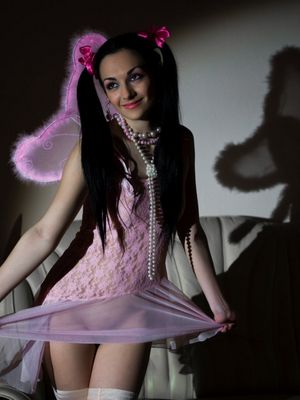 На большой диван присела отдохнуть таинственная эротическая фея. Загадочное лицо, черные волосы собраны в хвосты, белоснежная кожа, два нежных розовых крыла, платье и чулочки. Гостья прилетела в твой сон? Сказка очень сладкая – сексуальная девица оголилась и поглаживает себя.
