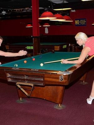 Увидев, как роскошная девка играет в бильярд, парень не удержался и стал гладить ее фигуристые формы. Под тонким и коротким платьем не было белья. Немного поиграв, блонди оголилась и игриво прогибая спинку, стала на колени и смачно отсосала напарнику. Дальше, удобно расположив бабу на столе, факер ее бурно отымел.